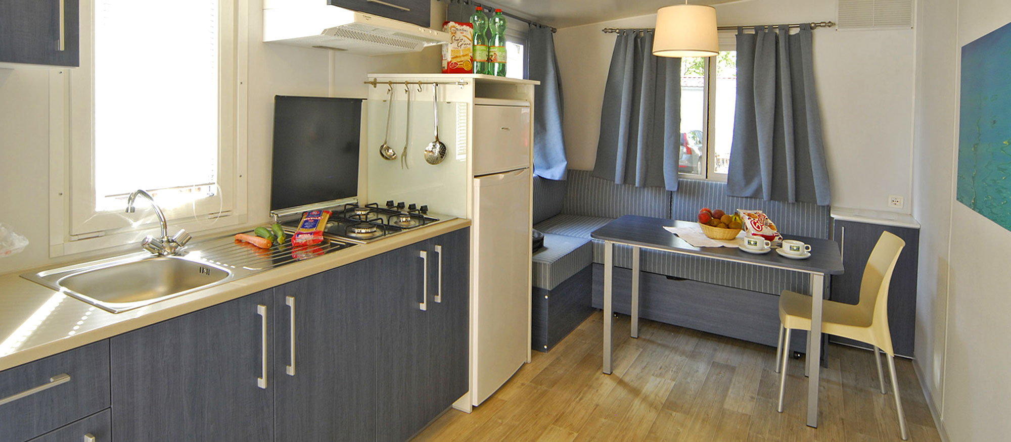 v bungalovu (BGW 4/6) nebo mobilhomu (MBH 4/6) s vlastním sociálním zařízením, obývací pokoj s kuchyňským koutem, TV, sejf, klimatizace